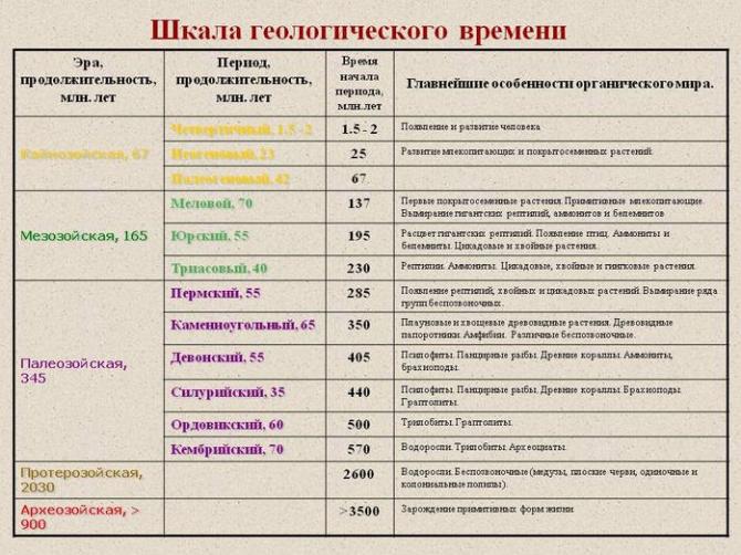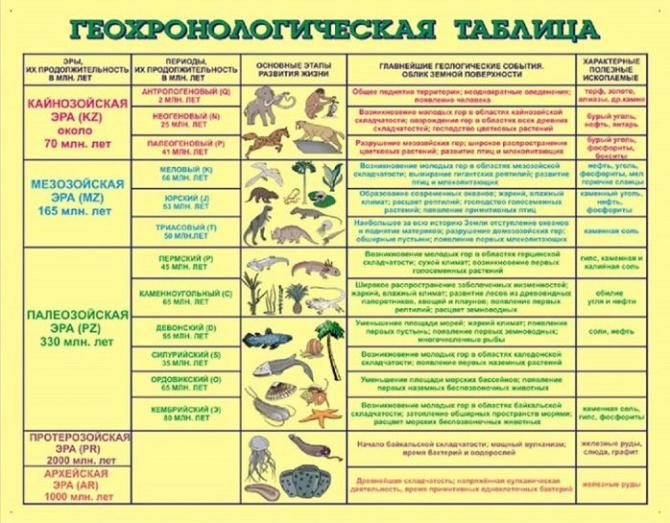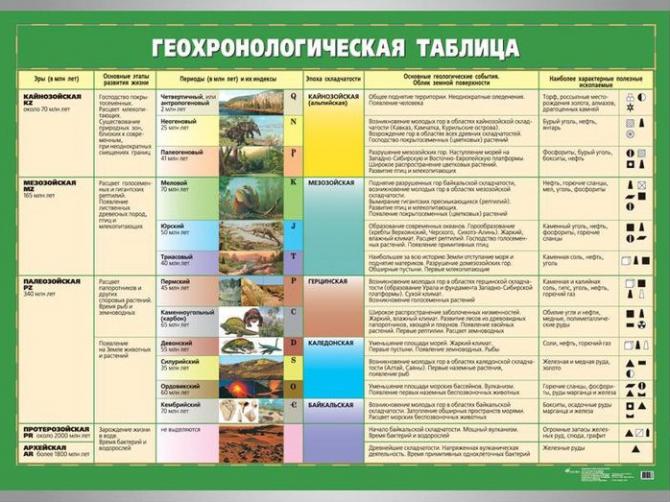 Любая эпоха откладывает собственный отпечаток на слой земли. Благодаря этому получилось составить геохронологическую таблицу на урок географии. В таблице любая эпоха отмечена своим цветом, он единичен для всего мира, и благодаря этому это целостная, глобальная система. Изучить периоды жизни земли по геохронологической таблице нужно заблаговременно, чтобы на уроке лучше усвоить материал.