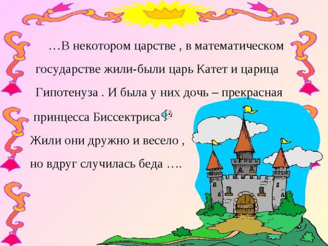 В неком королевстве, в математическом государстве жили-были царь катет и королева Гипотенуза. И была у них дочь — великолепная принцесса Биссектриса. Жили они дружно и забавно, но вдруг…