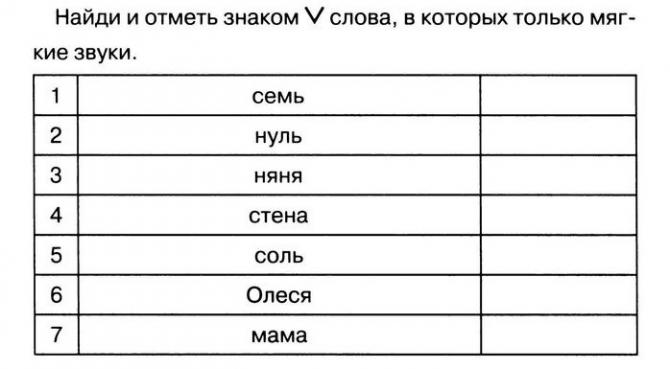 Найди и отметь знаком V слова, в которых лишь мягенькие звуки.