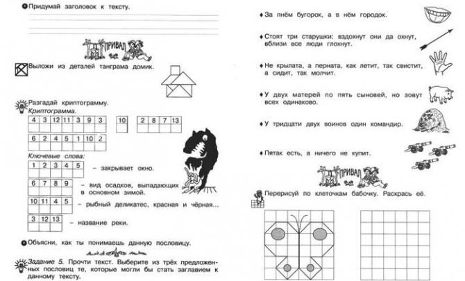 Придумай заголовок к тексту. Выложи из деталей танграма домик. Разгадай криптограмму.