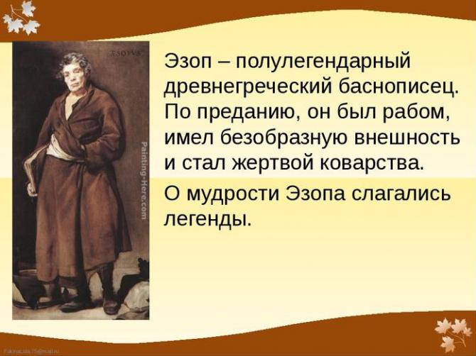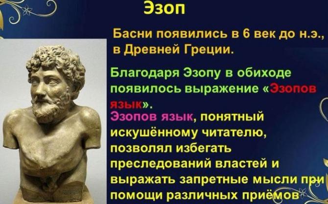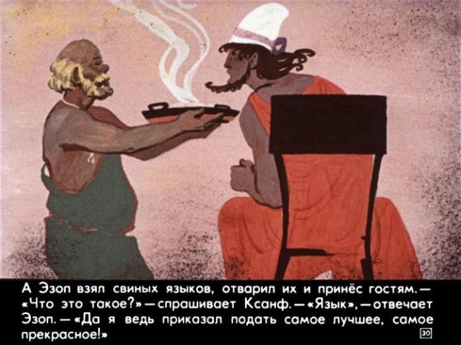 Эзоп был обыденным рабом, и однажды его владелец Ксанф попросил его приготовить ужин из самого превосходного, что есть в мире. Эзоп приготовил три блюда из языков. На вопрос владельца, почему все из языка, он ответил, что это самое великолепное, что есть на свете, потому что благодаря ему можно без боя покорять городка, сознаваться в любви. На последующий разов Ксанф попросил собственного раба приготовить блюдо из самого отвратительного, что есть в мире. И на свое удивление, он опять увидел на ужин языки. На немой вопрос владелец Эзоп ответил, что язык так же и самое нехорошее, что есть на свете, потому что им можно обидеть хоть какого жителя нашей планеты, огорчить самых близких. Так в российском языке благодаря рабу, появилось выражение «Эзопов язык».