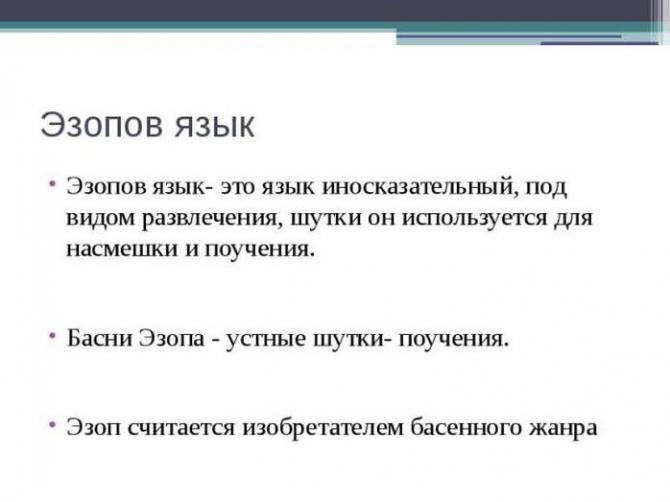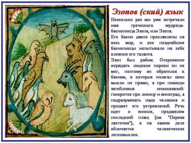 Эзопов язык, понятный искушенному читателю, дозволял избегать преследований властей и выражать запретные идеи при поддержки различных приёмов.