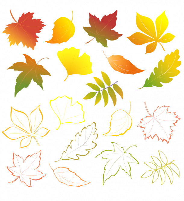 Осенние листья различаются прекрасной гаммой красок от сочных желтых до багряно-красных цветов. Охото собирать их связками и нести в дом. Подборка картинок шаблонов осенних листьев.
