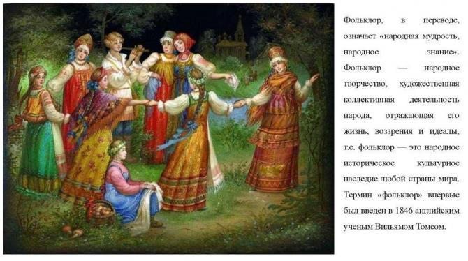 Фольклор — историческое народное творчество и культурное наследие страны. Басни, былины, присказки, считалки, песни — все это относится к фольклору. Фото картинки с видами фольклора ниже.