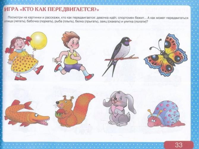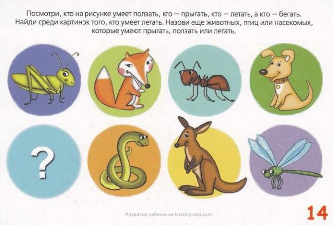 Взгляни, кто на рисунке умеет ползать, кто — прыгать, кто — летать, а кто — бегать.