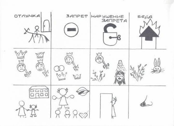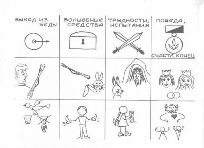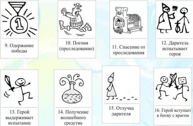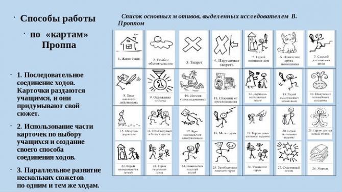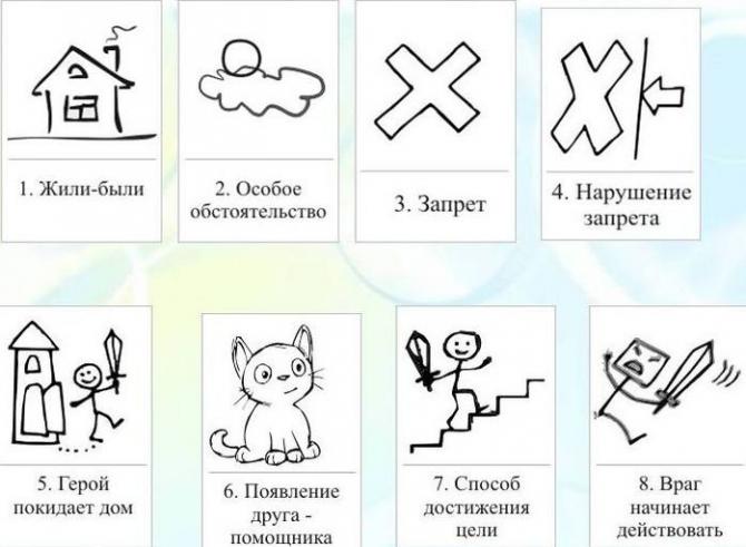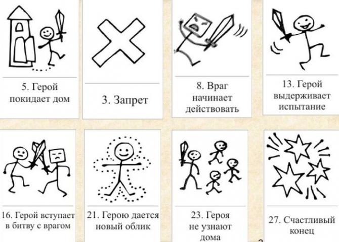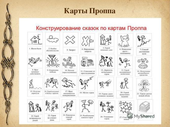 Знаменитый исследователь русских народных сказок В.Я. Пропп выделил закономерности сюжета, главных героев и лиходеев. И наглядно показал их в простых рисунках, благодаря которым дошкольникам легче понимать, и потом пересказывать сюжет своих любимых творений. На халяву скачать и распечатать примеры карт проппа можно из данной статьи. Читайте своему ребенку сказку, равномерно демонстрируя, либо без помощи других живописуя такие карты, а потом опосля чтения попросите его рассказать сюжет по сиим карточкам.