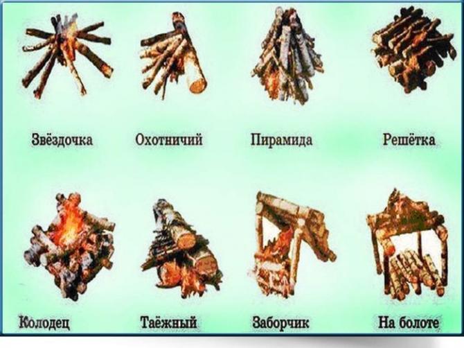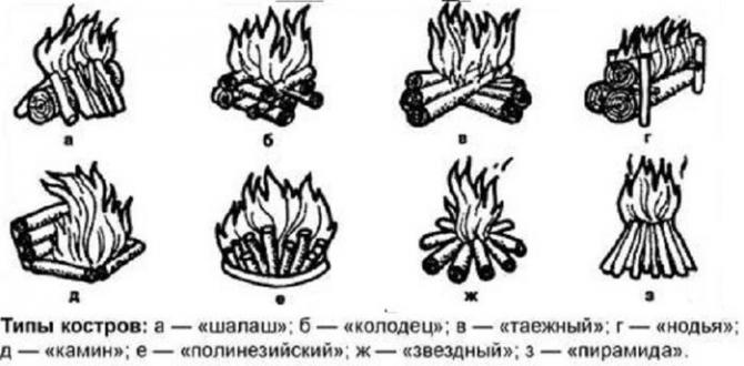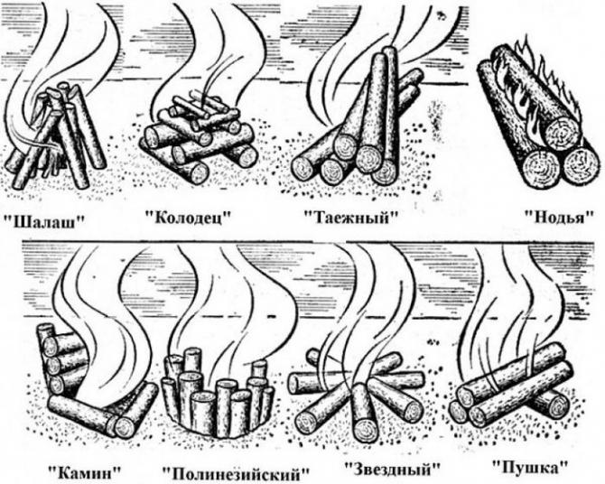 Костры типа звёздочка, пирамида, для разведения на болоте.