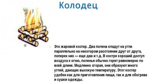 Традиционно для новенького в походе не возникает вопросца какой костер разводить. Он просто берет и разводит костер, укладывая поленья в хаотичной последовательности. Бывалые же люди знают как разводить несколько типов костров, какой из них лучше подходит для разогрева еды, какой для просушки одежды и освещения места, а какой идеальнее всего использовать для ночлега. Даже ежели вам завтра не идти в поход, а просто на урок обж в 6 класс Вам непременно понадобятся познания о видах костров. Красивые рисунки охотничьего, нодьи, шалаша, колодца и костра типа звезда вы сможете увидеть здесь.