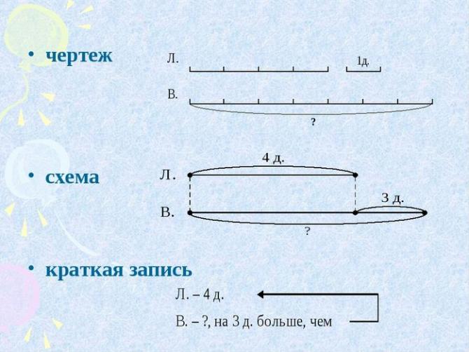 Схематические красивые рисунки к задачкам по арифметике помогают лучше понимать систему решений образцов этого типа. Что такое схематический набросок по арифметике не постоянно явно для воспитанника 2-3 классов, но дословно через пару занятий становится понятна логика решения задач. Чтобы заблаговременно подготовить собственного малыша к этому материалу, осмотрите с ним фото картинки из данной статьи.