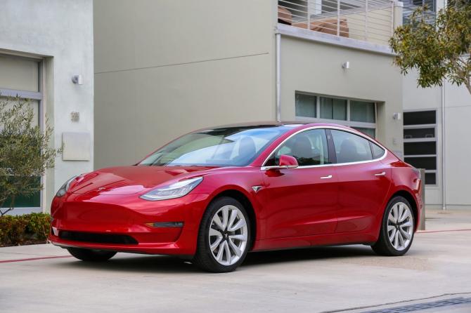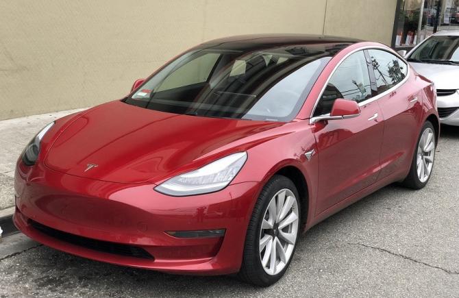 Электромобиль Тесла красноватого цвета.