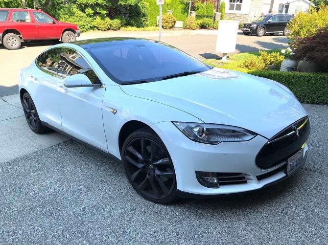 Сероватый электромобиль Тесла.