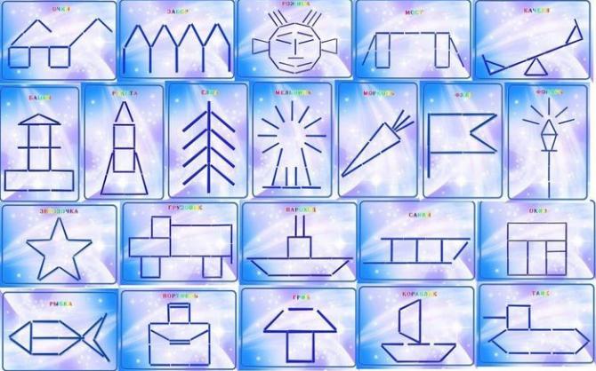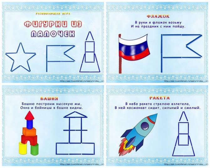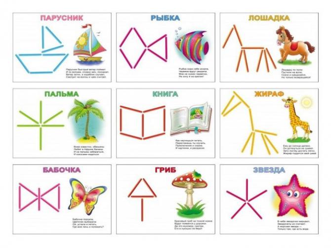 Фото картинки из счетных палочек для дошкольников могут помочь ребятам в игровой форме привыкнуть к счёту. А для образчика фигур можно взять красивые рисунки из данной статьи.