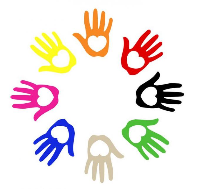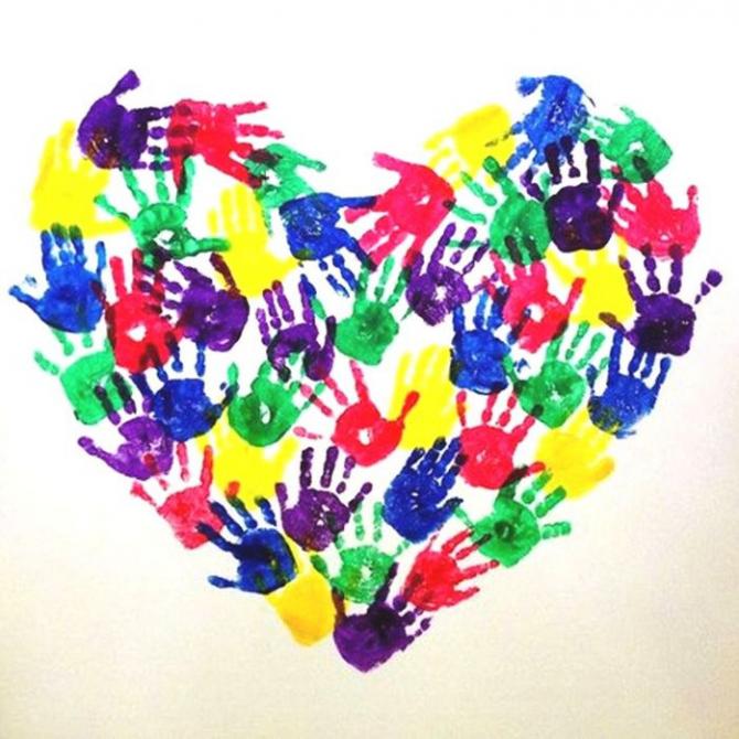 Большое сердечко из отпечатка ладоней в ребяческом саду.