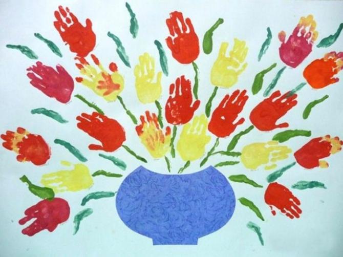 Цветы, нарисованные отпечатками ладоней.
