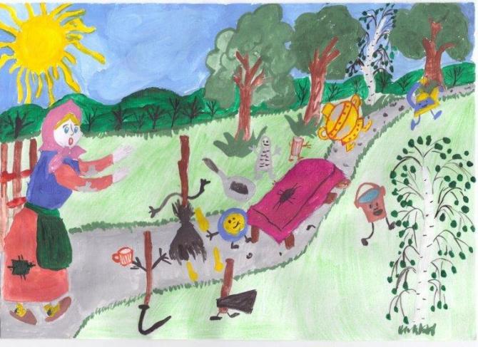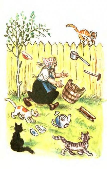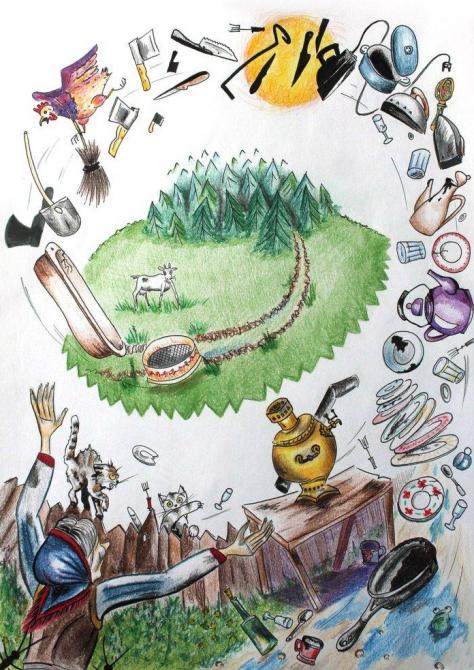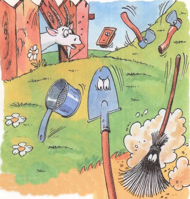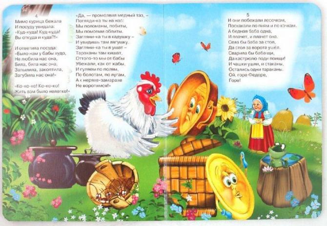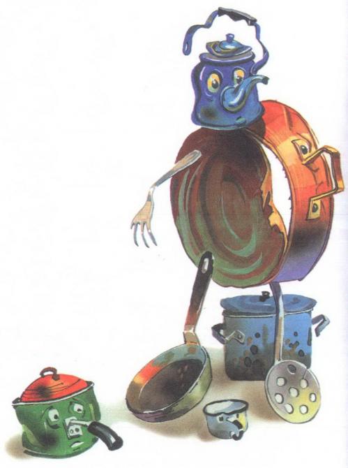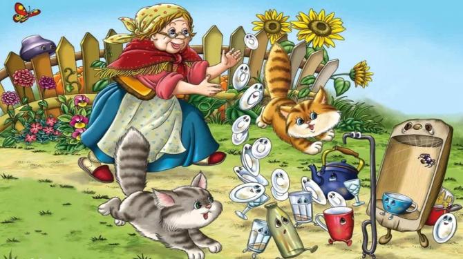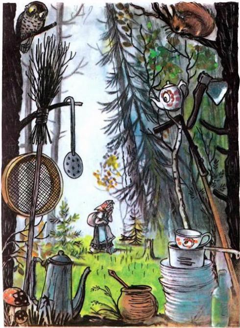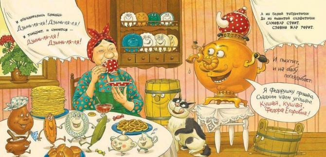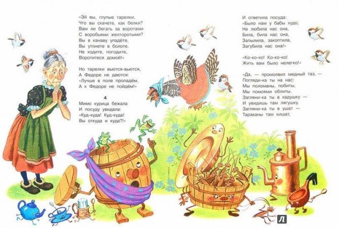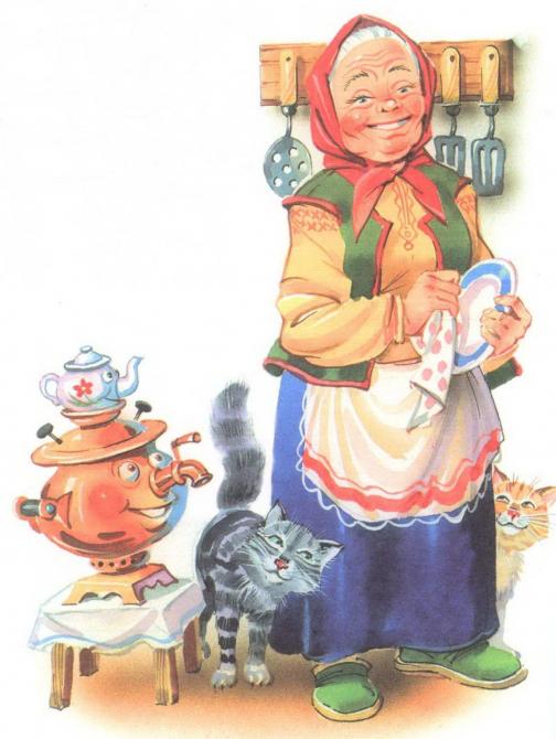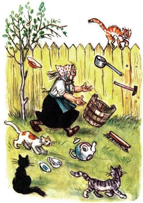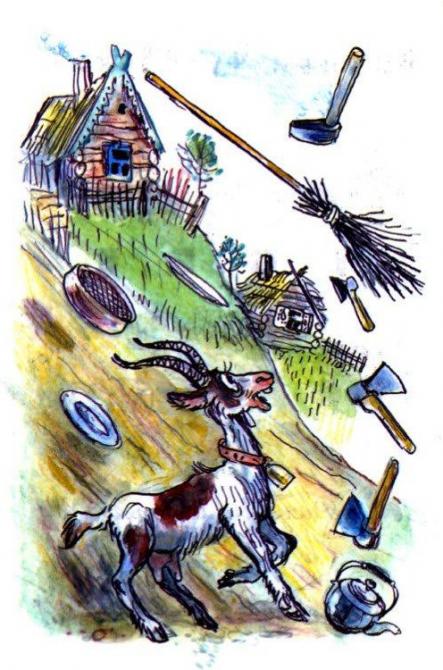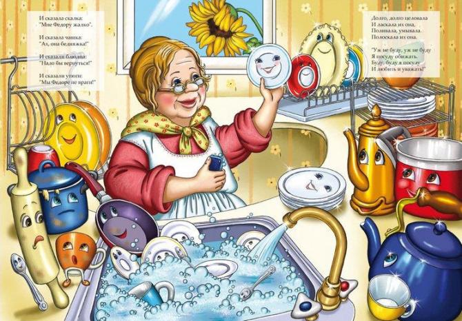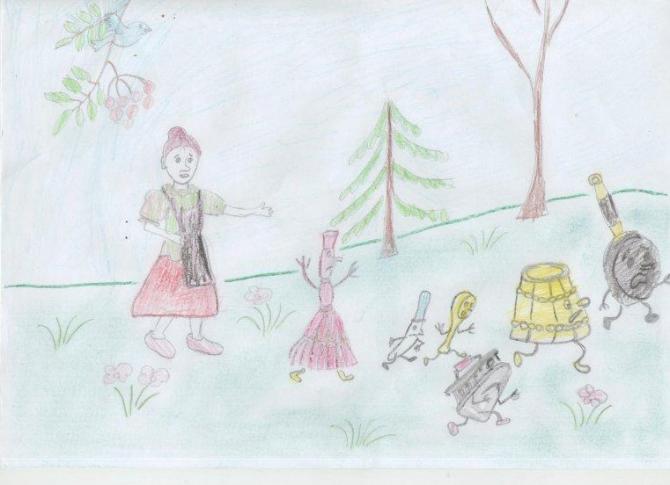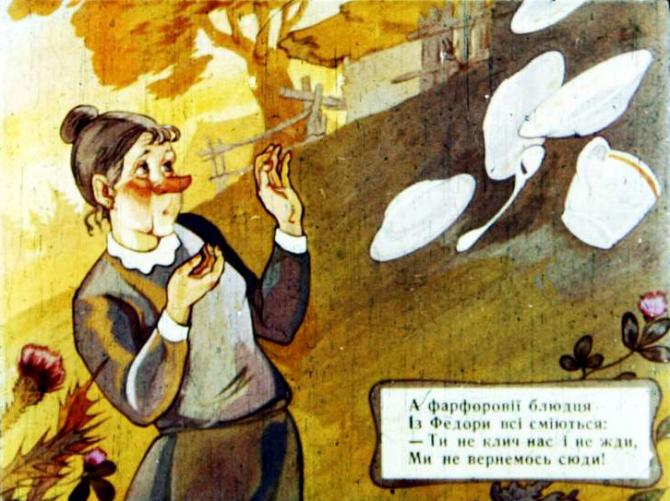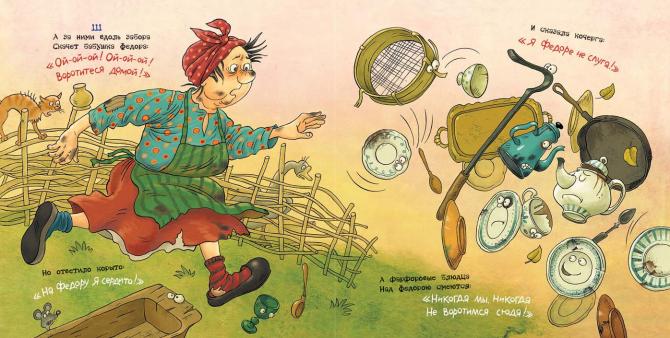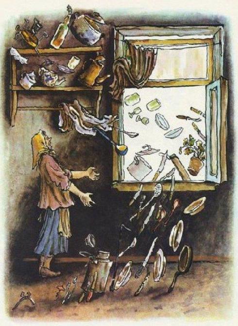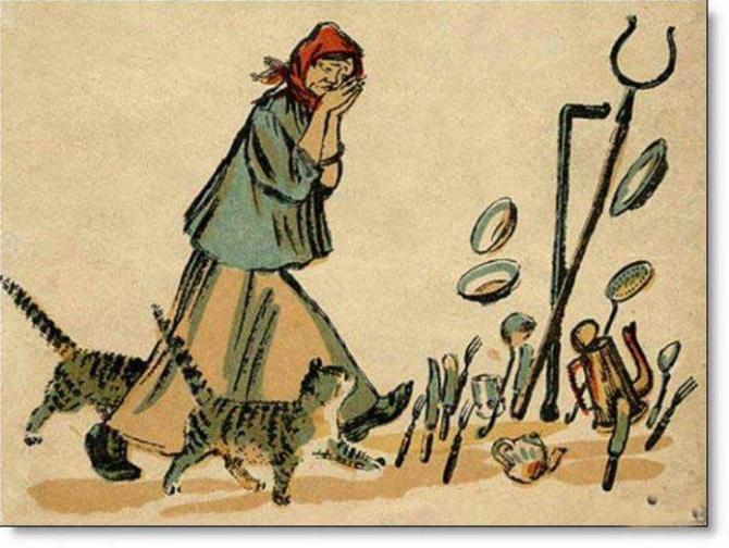 От бабушки Федоры удрала вся посуда, кухонная утварь, столовые приборы и остальные нужные в хозяйстве вещи. Фото картинки из басни ниже.