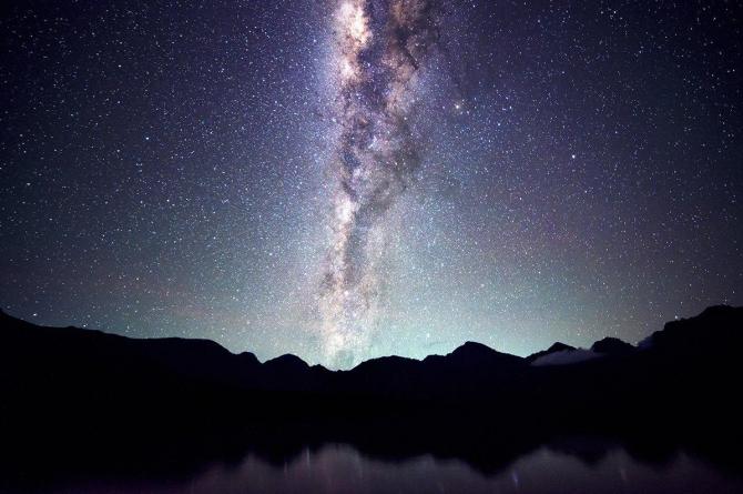 Горы и озеро на фоне галактики