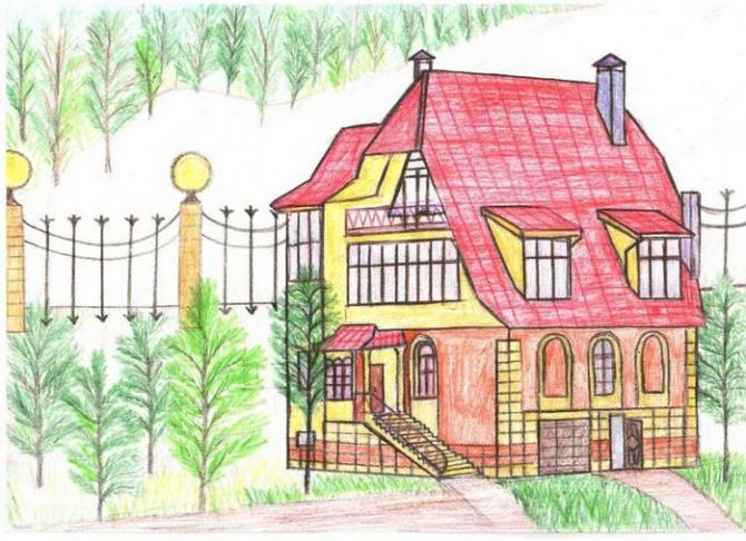 Ребяческий набросок дома простыми карандашами.
