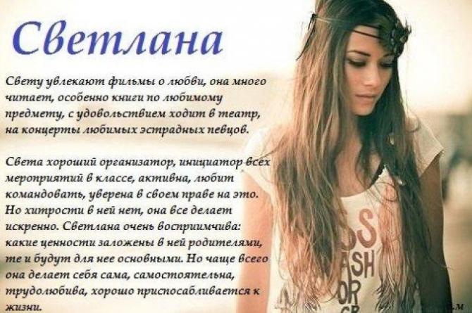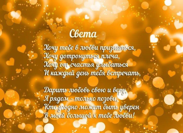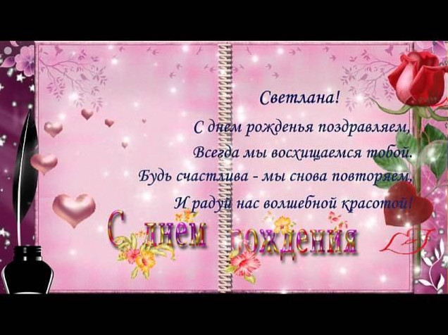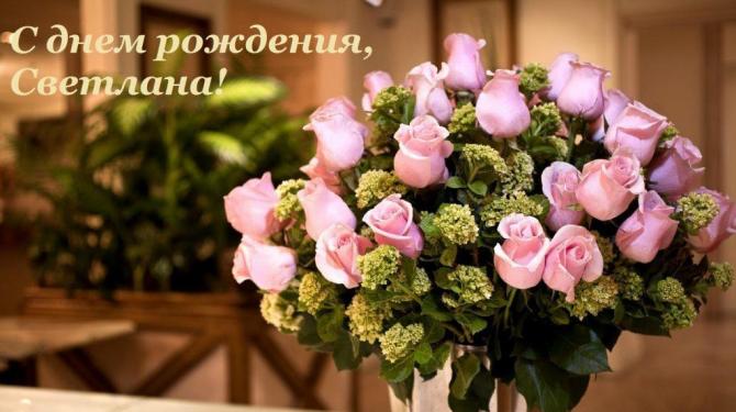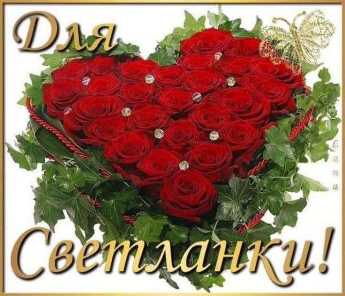 О значении имени Светлана до сих пор не угасает спор. Ранее подразумевали, что оно славянское и имеет значение «светлая». Некие ученые думают, что оно древнегреческое. 1-ое упоминание именя Света в поэме А.Х. Востокова «Светлана и Мстислав» датируется 1802 годом. Мы хотим предложить к просмотру фото картинки с пожеланиями, признаниями в любви Светлане. Наслаждайтесь!
