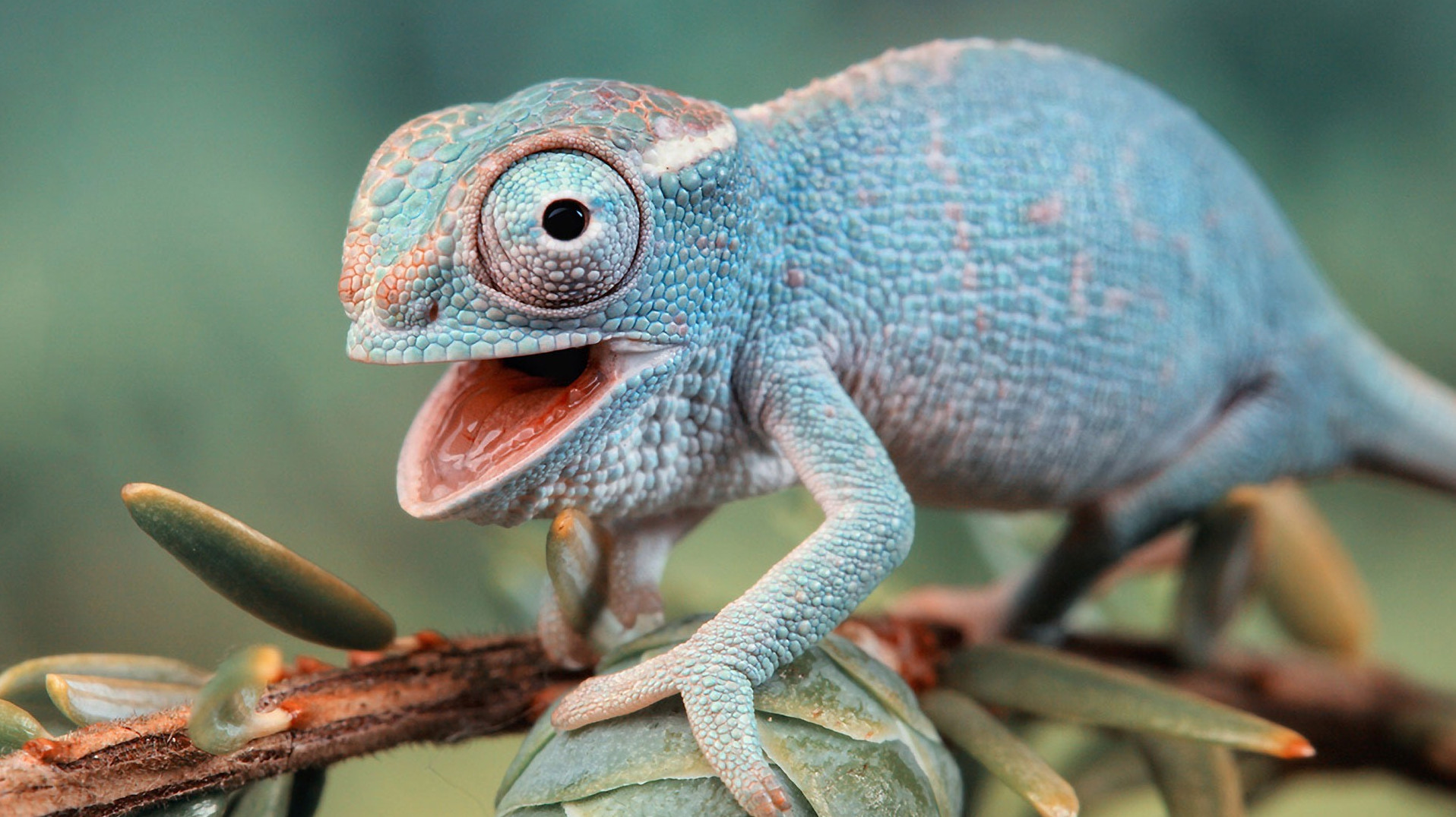 Ясная заставка на телефон с хамелеоном голубого окраса.