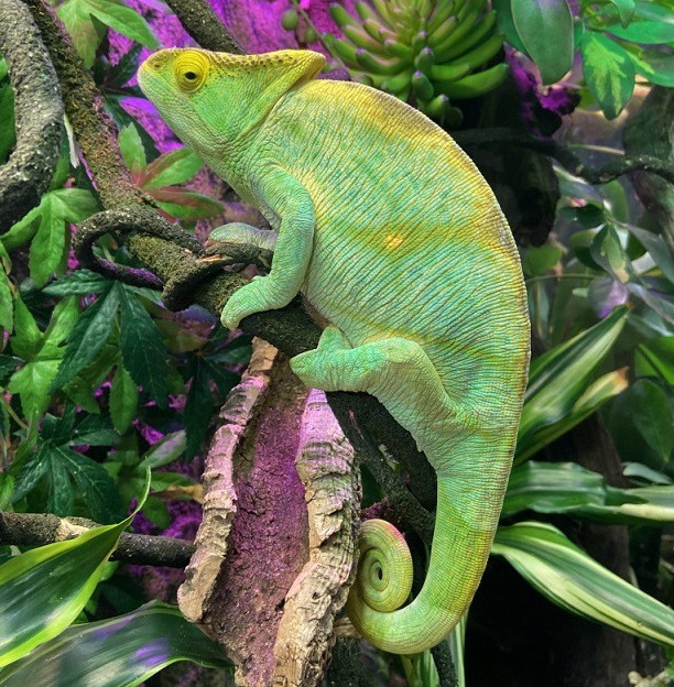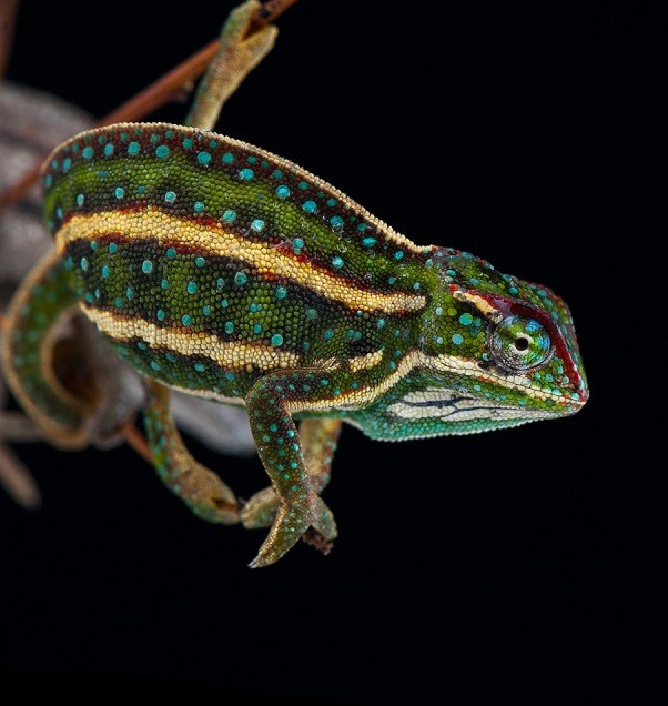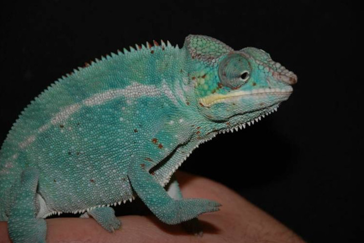 Великолепный хамелеон ясно желтоватого окраса с голубыми и темными пятнышками.