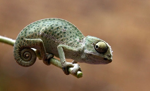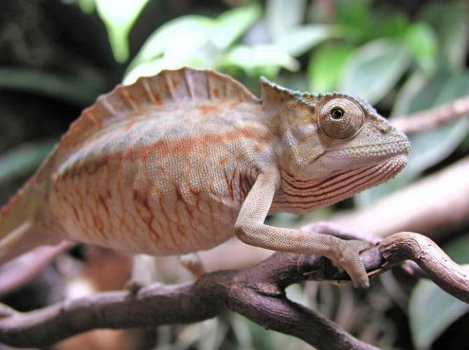 Хамелеон лезет по ветке.