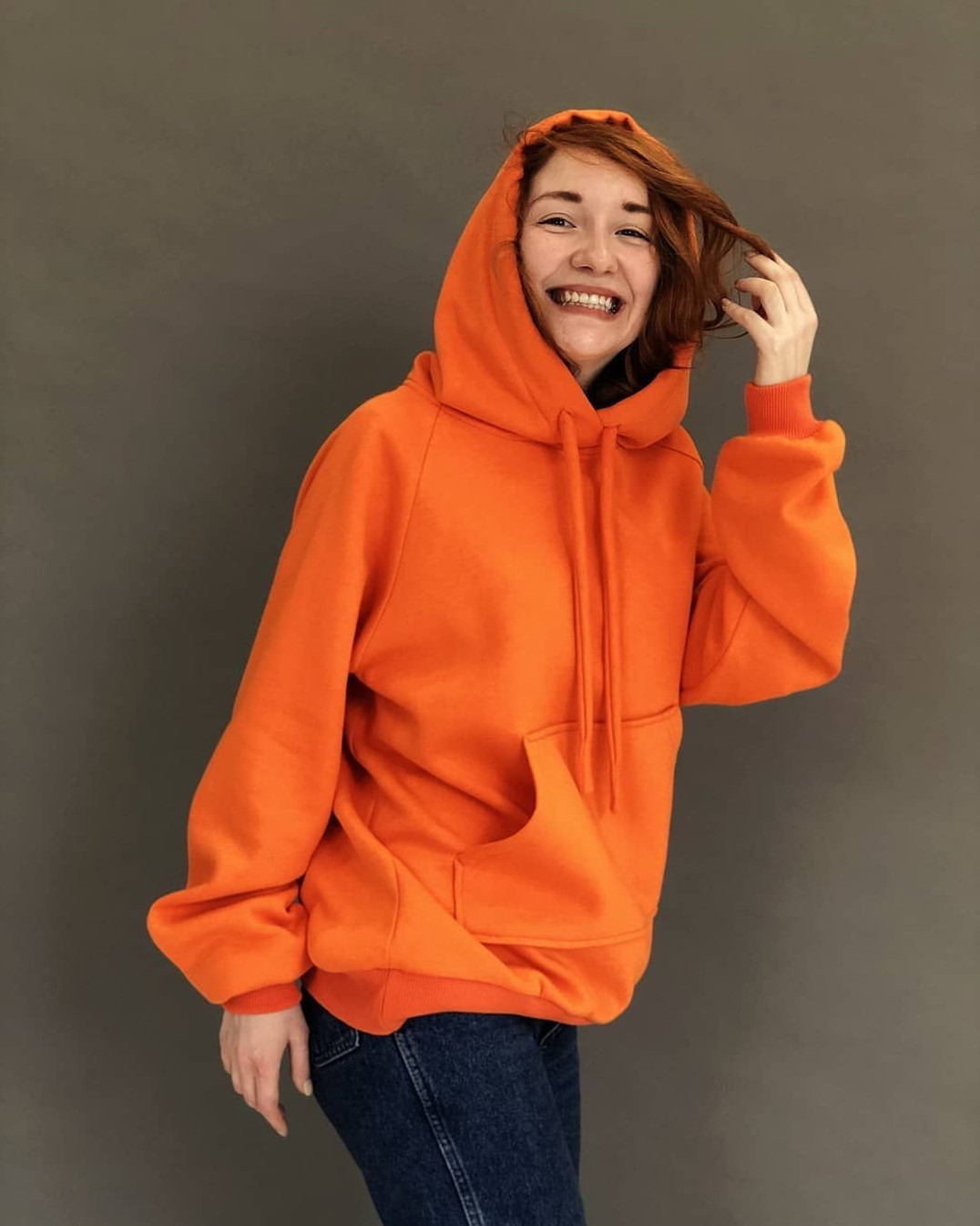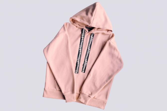 Красноватая худи на девушке.