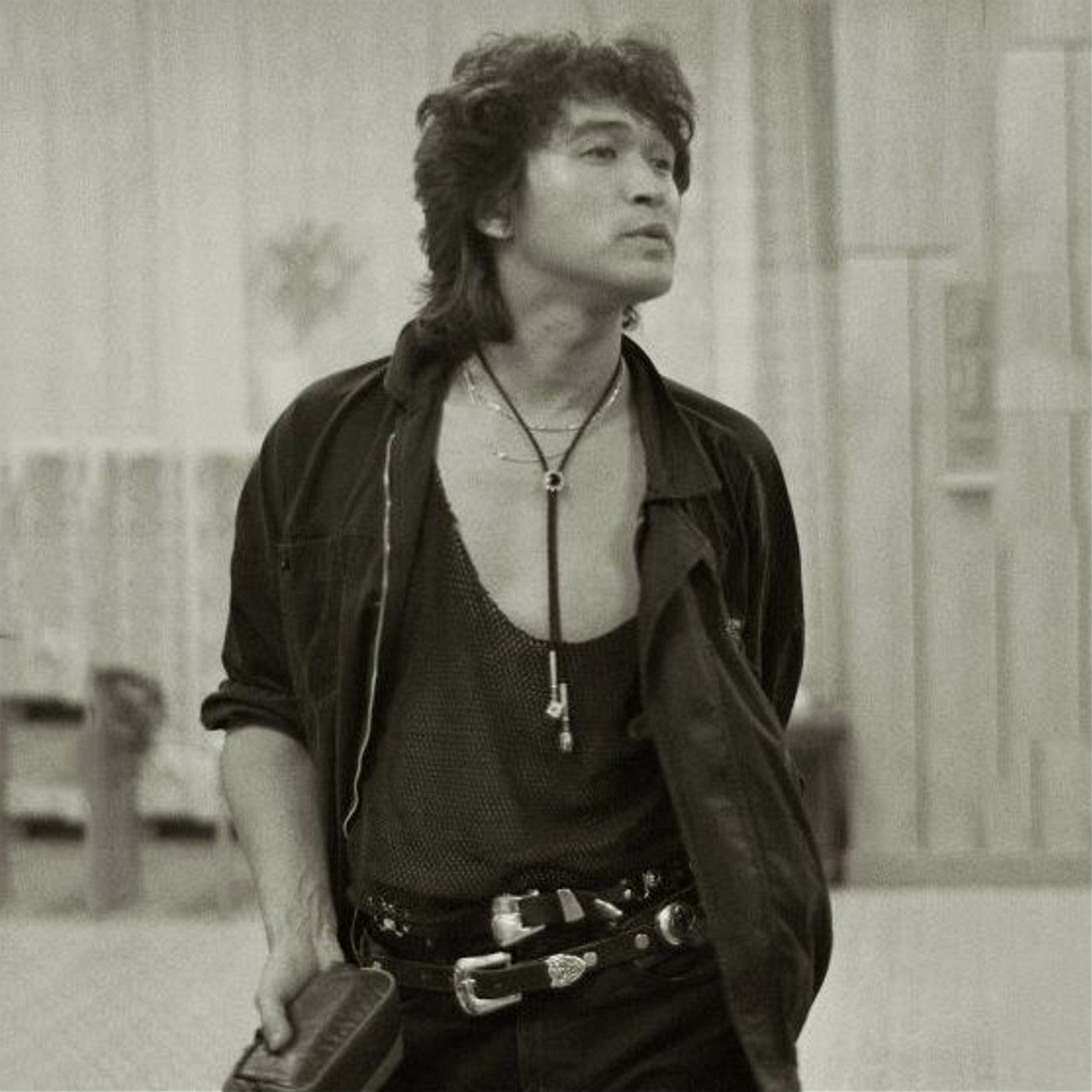 Музыкант позирует у стены.