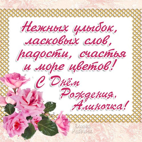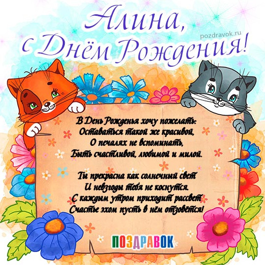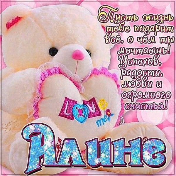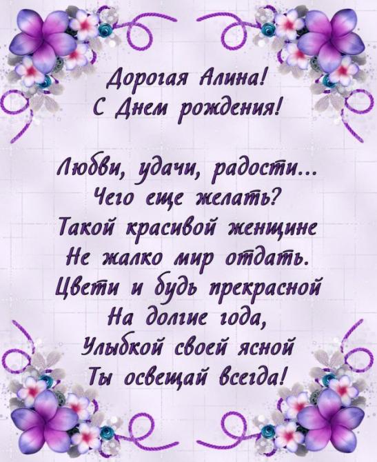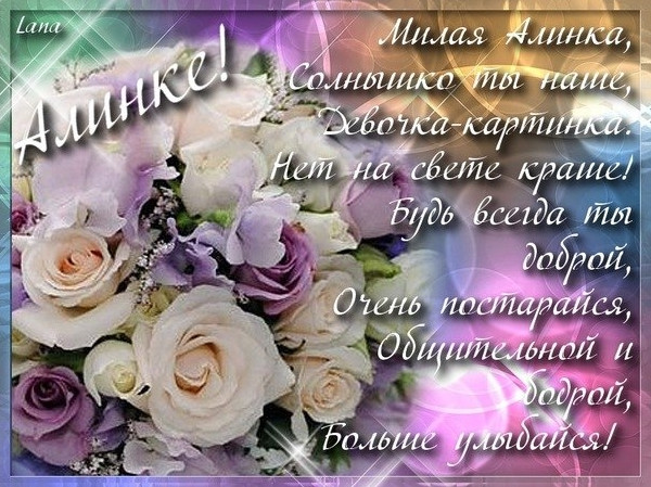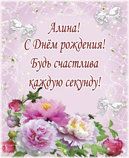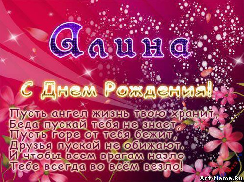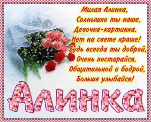 Значение имени: в переводе с древнегерманского «благородная». В детстве Алина растет болезненной, сердитой и раздражительной девченкой. Нередко она схожа и снаружи, и по характеру на отца. Алина обладает великолепной памятью, превосходно обучается. Она любит рисование, чтение. В школе у Алины складываются не очень обыкновенные дела с ребятами из-за ее конфликтности и склочности. Растя, Алина становится наиболее безмятежной, сдержанной и мягенькой. Но упрямство и свое вольность у Алины остается на всю жизнь. Семейную жизнь Алина устраивает довольно поздно. Дома Алина великолепная хозяйка, которая нередко принимает гостей. Со свекровью складываются трудные дела, поэтому предпочитает жить раздельно. Алина умеет быть симпатичной и занимательной. У нее великолепный вкус, она постоянно превосходно одета, любит похвалиться обновками. Алина может реализовать себя в качестве доктора, конструктора, журналиста, музыканта и преподавателя. Дальше предлагаем посмотреть очень красивые фото картинки «С деньком рождения Алина».