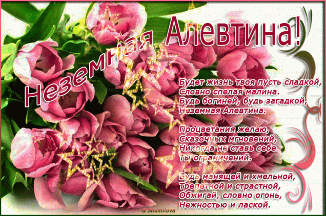 Значение имени Алевтина: «чуждая дурного», «натирающаяся благовониями»(древнегреч.). Алевтина может быть в детстве болезненным ребенком. Нередко склонность к простудным болезням остается и во взрослом возрасте. Алевтина может быть чрезвычайно резкой в общении, склонной к конфликтам. Нередко у женщины с таким именованием не складываются дела со своей матерью. Невзирая на это Алевтина целеустремленна и настойчива, постоянно достигает желанного и может достичь высот в своей карьере. Алевтина традиционно самолюбива, очень гордится собой и своими достижениями, при всем этом любит предъявлять высокие требования к окружающим и часто критикует их. В отношениях Алевтина выбирает долготерпеливого и спокойного мужчину, способного вынести ее вспыльчивость и эмоциональность. При всем этом в семье она превосходная хозяйка и заботливая мать. Уменьшительно-ласкательные формы имени: Алевтинка, Алевтинушка, Алевтиночка, Ала, Аля, Алечка, Алюшка, Тина, Тинка, Тиночка, Тинчик. Дальше предлагаем посмотреть прикольные и смешные фото картинки «С деньком рождения Алевтина».