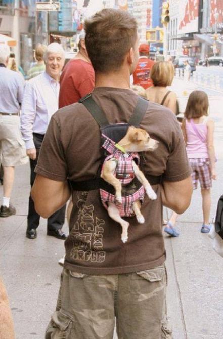 Несет собаку на спине.