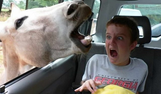 Мальчуган ужаснулся жеребца в машине.