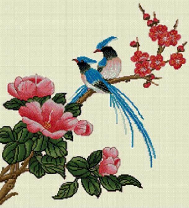 Вышивка птицы, цветы.
