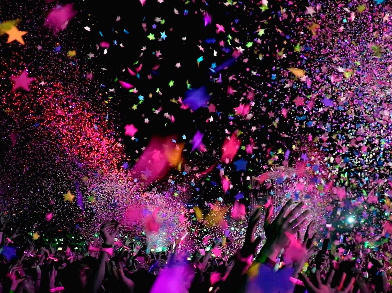 Разноцветные блестки летят.