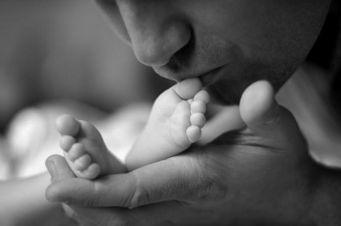 Отец целует ноги малыша.
