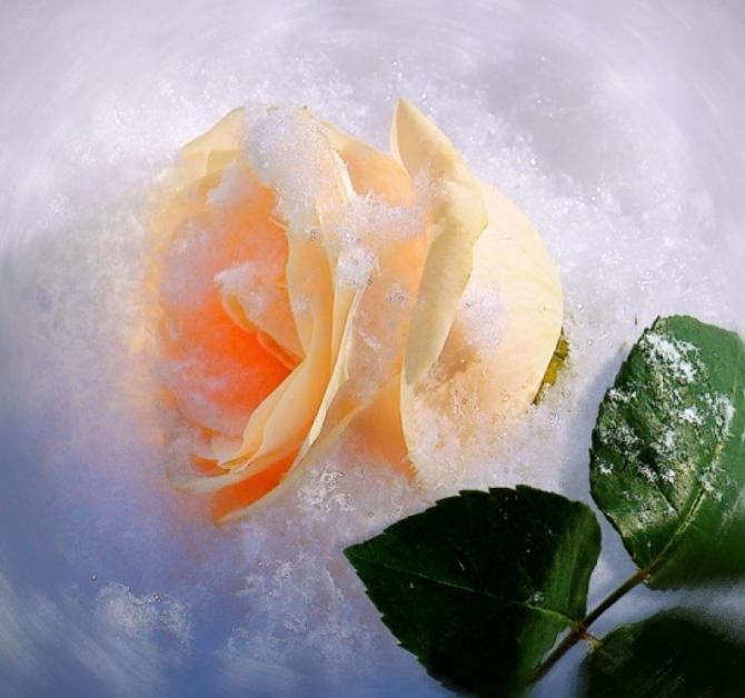 Желтоватая роза в снегу.