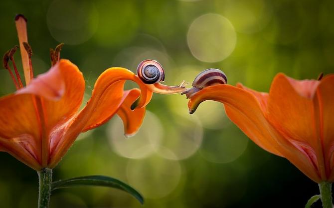 Милые улитки на цветах.