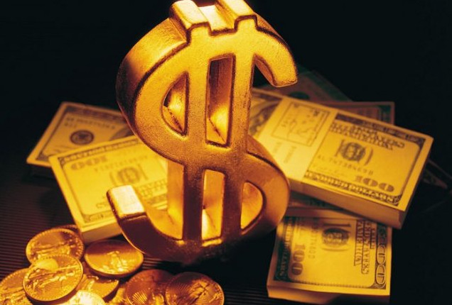 Золотые слитки, монеты, купюры.