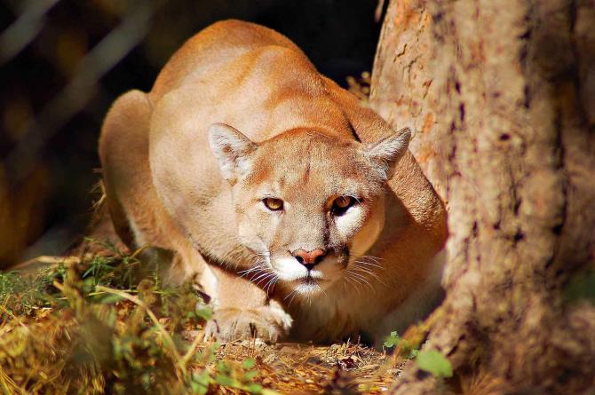 Затаившееся животное у дерева.