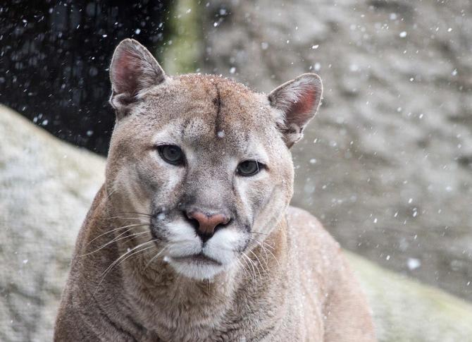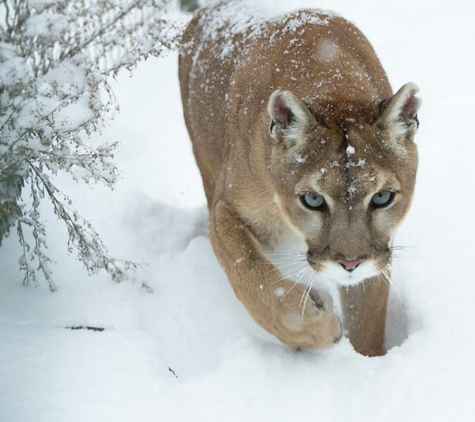 Пума на зимнем снегу.