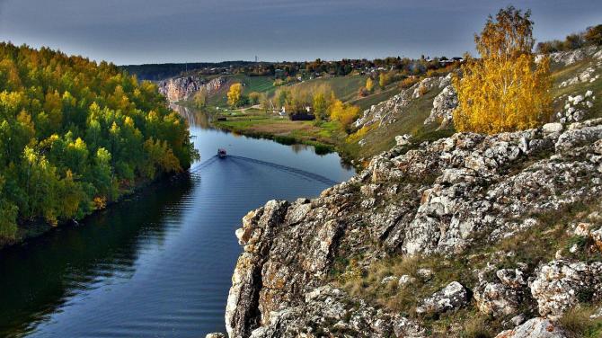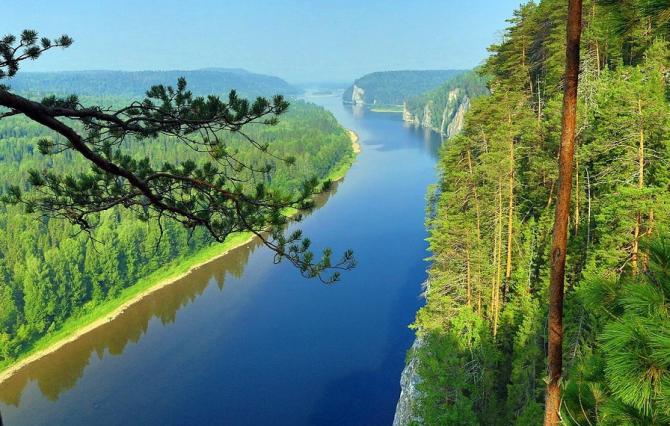 Скалы и деревья на берегах.