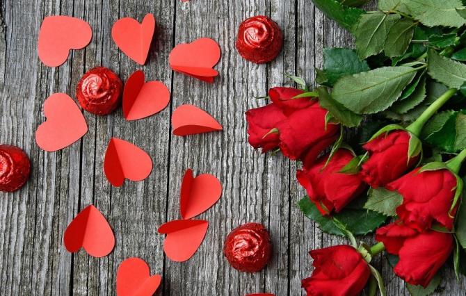 Розы, шоколад, сердечки.