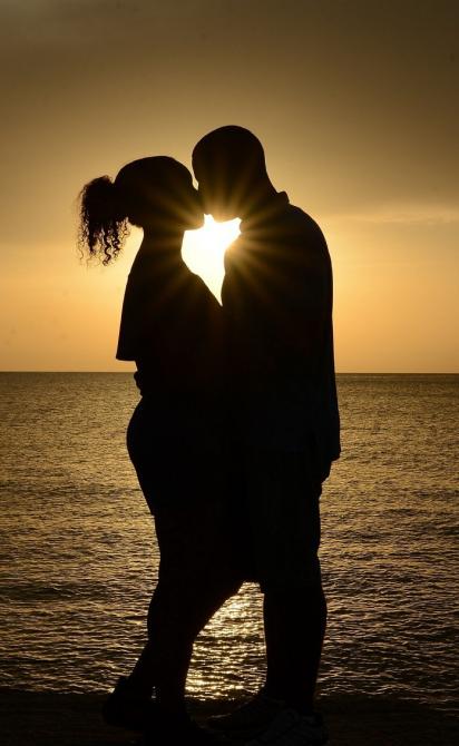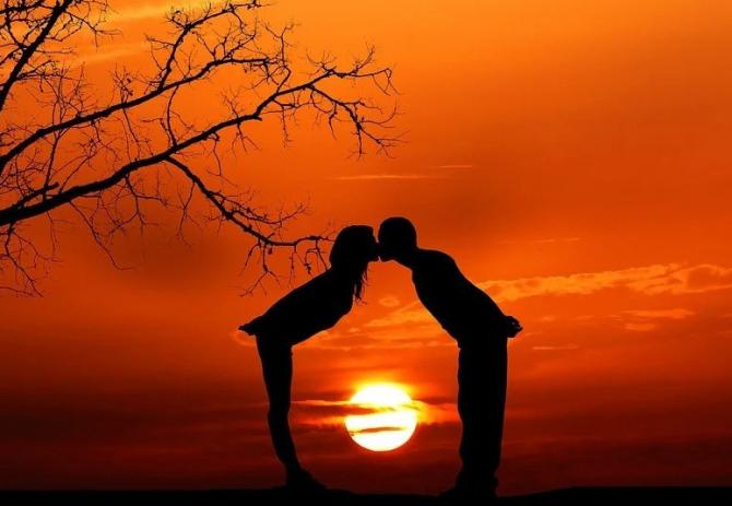 Ласковый поцелуй на фоне заката.