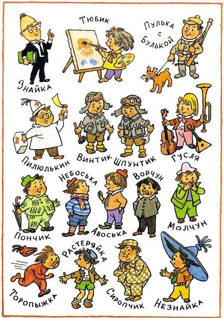 «Незнайка на Луне» — роман-сказка Николая Носова. Дальше предлагаем рисунки главных героев Незнайки с именами.