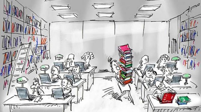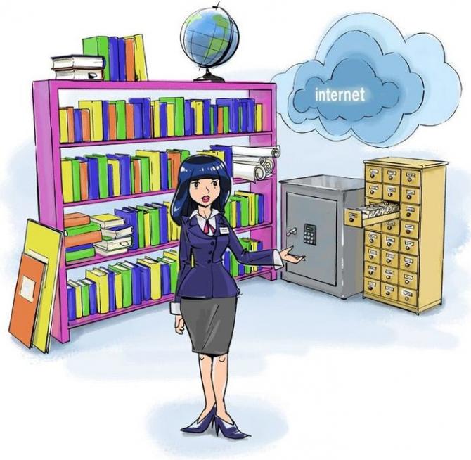 Работа библиотекаря проходит в библиотеке, посреди книжек.