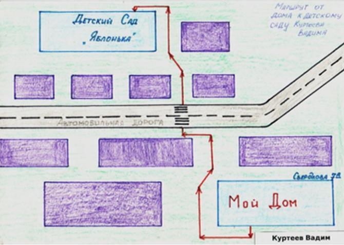 Ребяческий набросок безопасной дороги от ребяческого сада до дома.