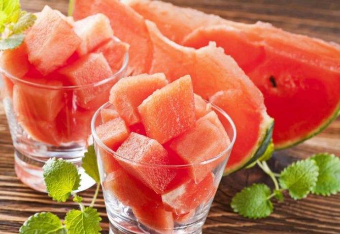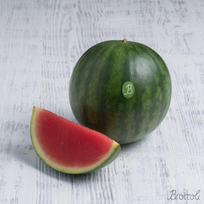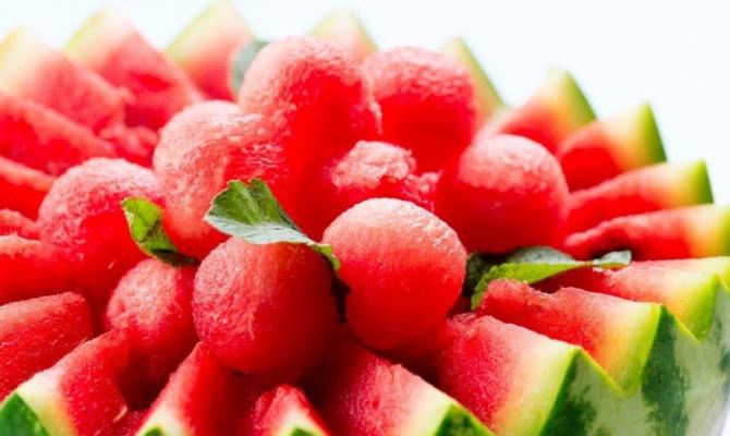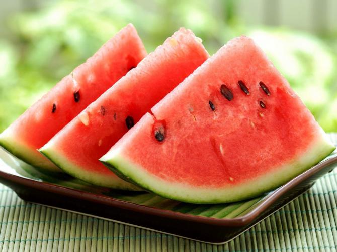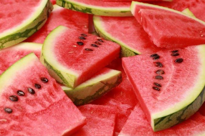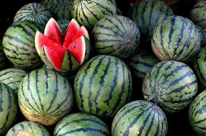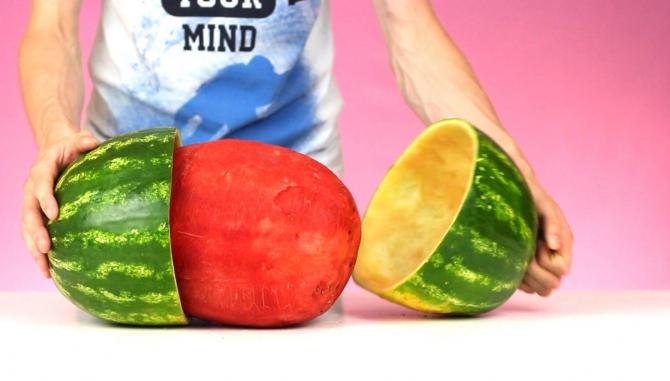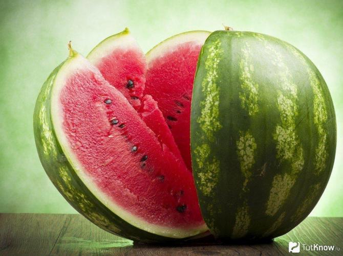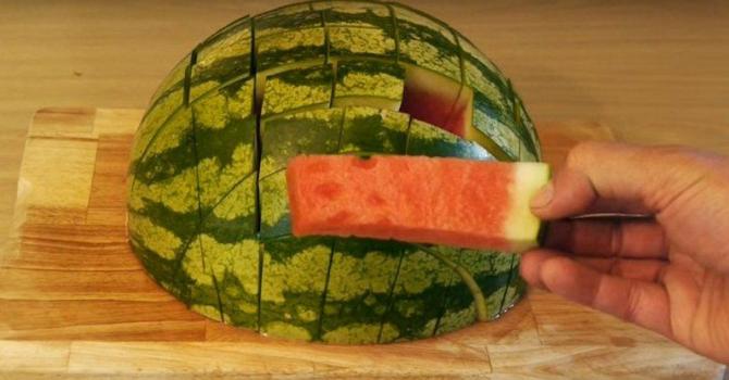 Человек держит в руке кусочек арбуза, половинка арбуза на столе