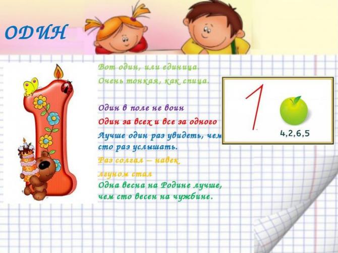 Стихи про цифры. Вот один либо единица очень узкая, как спица.
